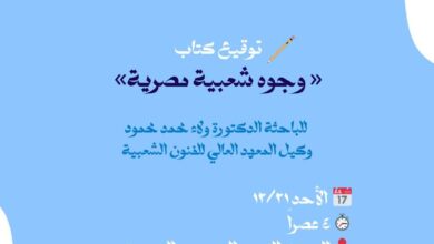 نظم المركز القومي للمسرح والموسيقى والفنون الشعبية برئاسة المخرج عادل حسان، حفل توقيع كتاب «وجوه شعبية مصرية» للدكتورة ولاء محمد، وكيل المعهد العالي للفنون الشعبية بأكاديمية الفنون، وذلك في الرابعة من عصر اليوم الأحد 21 ديسمبر 2025، بمقر المتحف القومي للمسرح والموسيقى والفنون الشعبية بالزمالك.