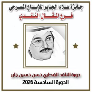 أعلن المنسق العام لجائزة علاء الجابر للإبداع المسرحي ، الكاتبة والناقدة د. صفاء البيلي، عن البدء بإطلاق أول فروع الجائزة في دورتها السادسة 2026، وهو فرع المقال النقدي، الذي سيكون هذا العام باسم الناقد القطري الراحل حسن حسين جابر .