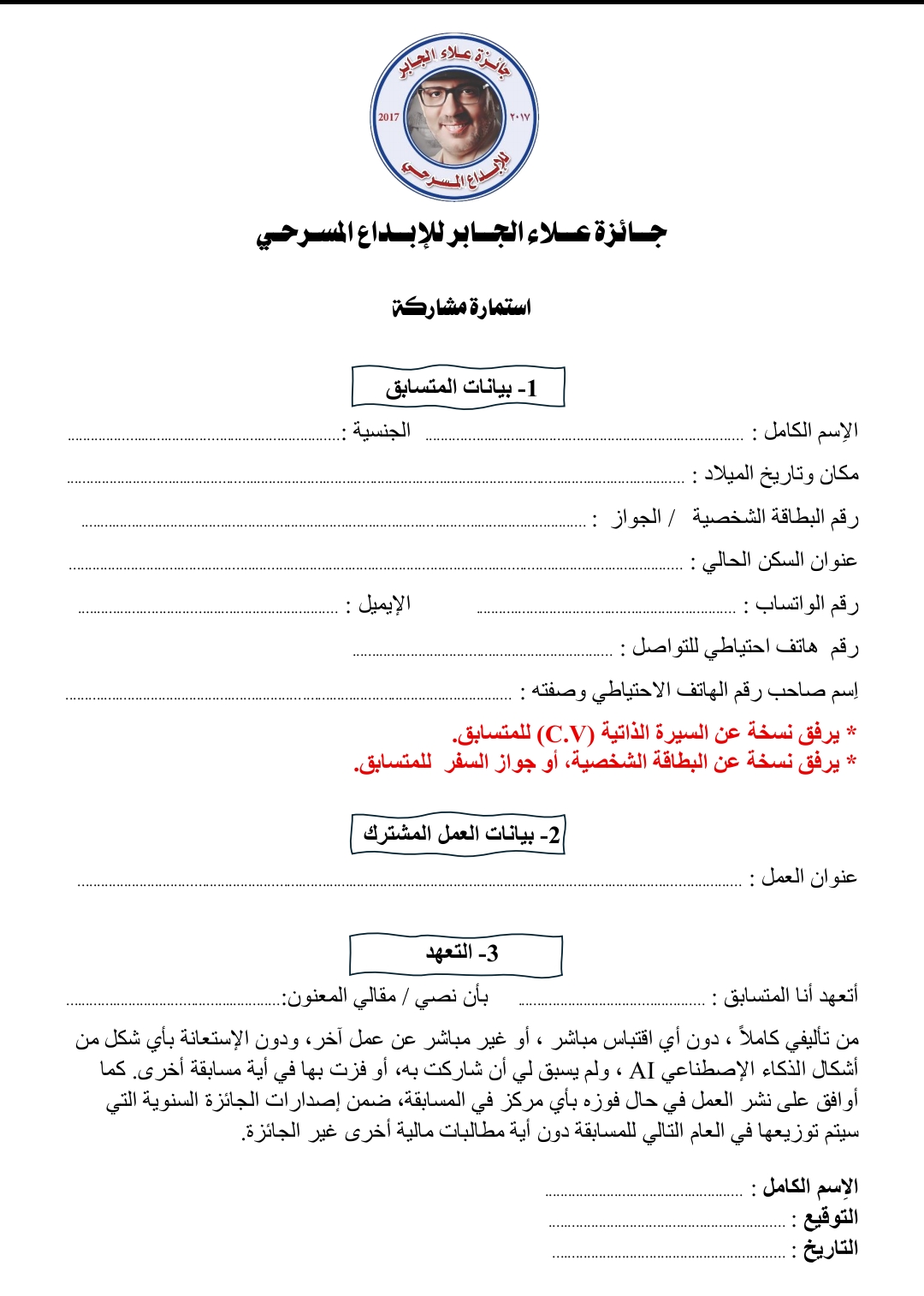 ـ تُرسَل الأعمال المُرَشَّحة، وجميع المُرفقات إلى الإيميل التالي:aljaber.award@gmail.com