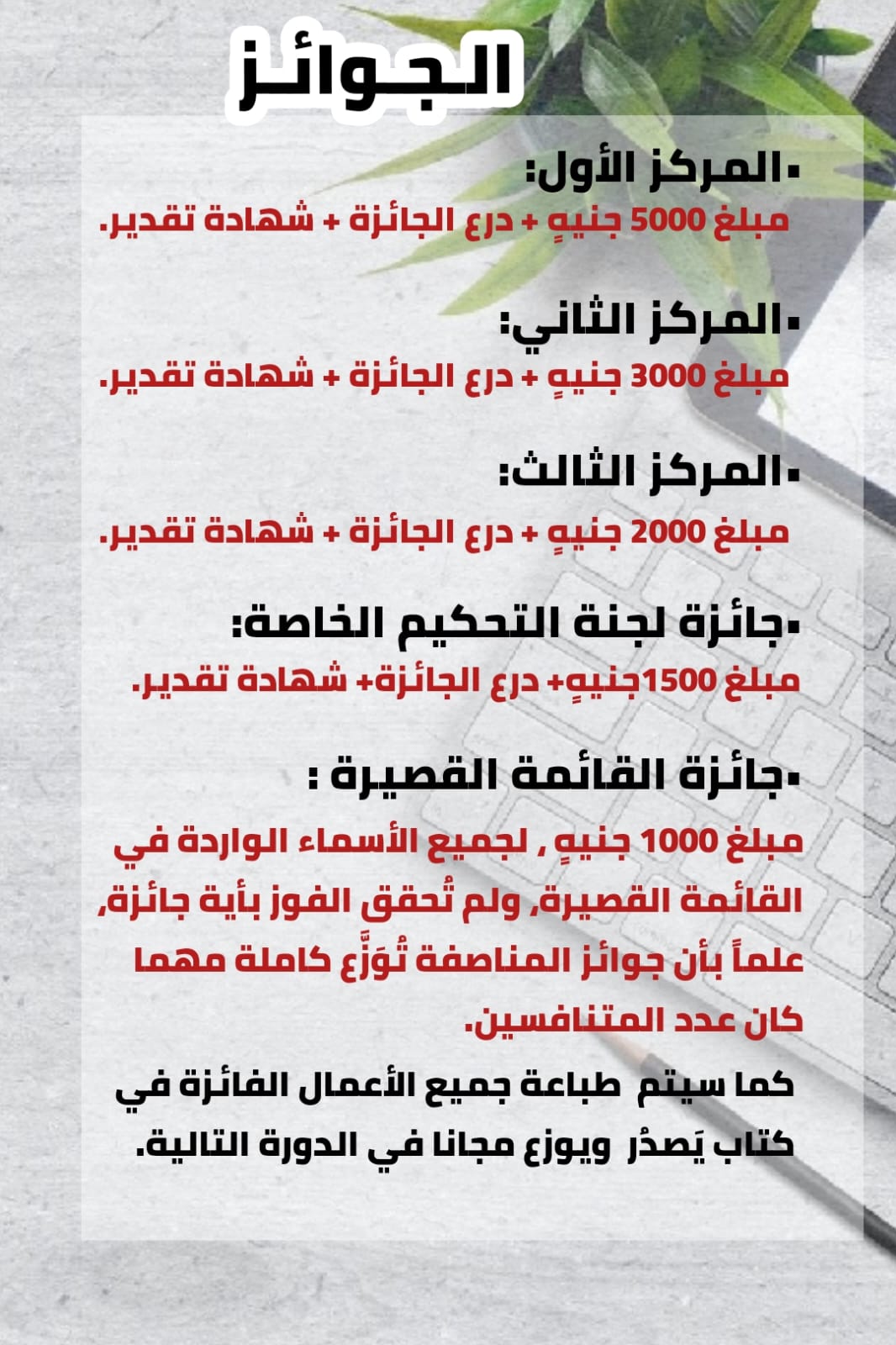 المركز الأول : أصبحت الجائزة 5000 جنيهٍ للمقال بدلاً عن 3000 جنيهٍ.